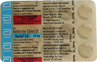Vertin 16 Tablet is a prescription medication used to manage symptoms of Ménière’s disease, including vertigo, ringing in the ears (tinnitus), and dizziness. It contains Betahistine (16 mg) as the active ingredient, which improves blood flow to the inner ear and reduces fluid pressure.