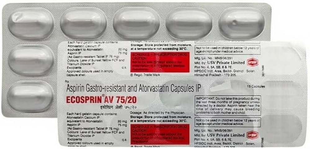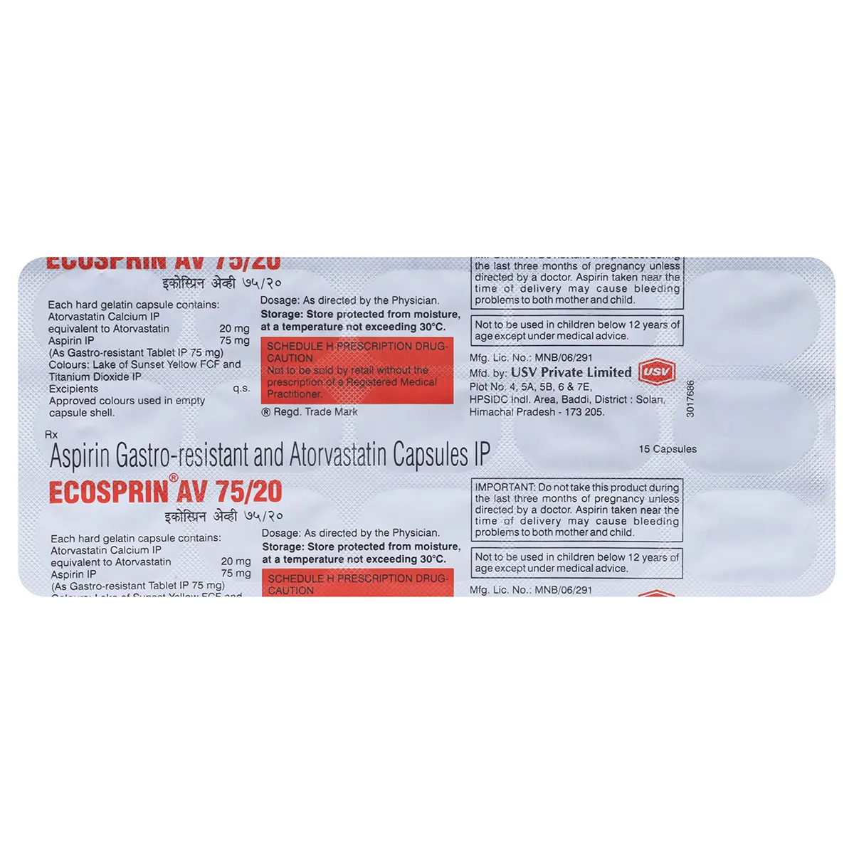 Ecosprin AV 75/20 is a prescription combination medication used to prevent heart attacks and strokes by managing cholesterol and preventing blood clots. It consists of 75 mg of Aspirin (an antiplatelet/blood thinner) and 20 mg of Atorvastatin (a lipid-lowering statin). It is typically taken once daily with food to lower “bad” cholesterol and reduce cardiovascular risks.