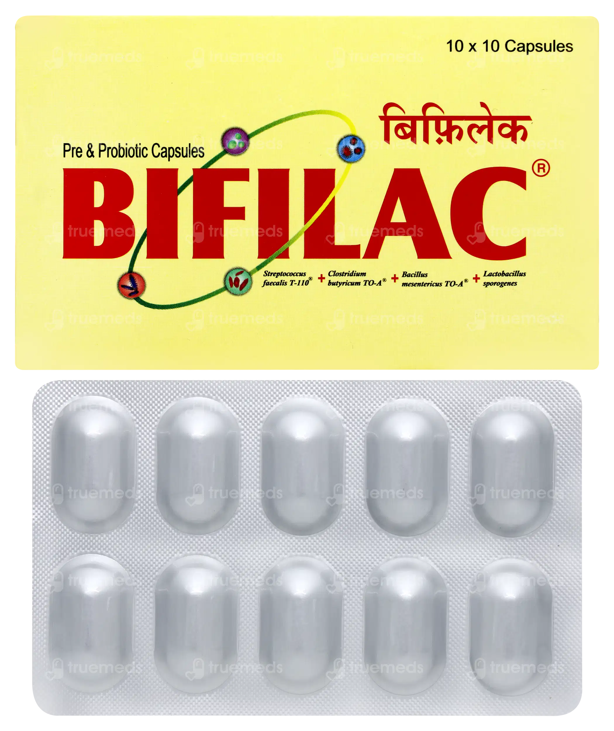 Bifilac is a pre- and probiotic medication, commonly available as capsules or sachets, designed to restore healthy intestinal flora, manage diarrhea (including antibiotic-associated), treat irritable bowel syndrome, and aid digestion. It uses a blend of four bacteria—Streptococcus faecalis T-110, Clostridium butyricum TO-A, Bacillus mesentericus TO-A, and Lactic acid bacillus—to inhibit pathogens and normalize gut health.