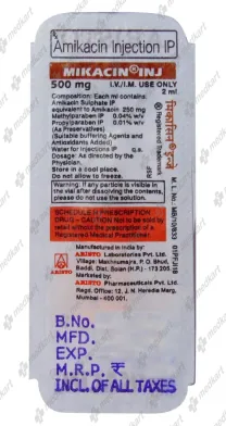 Mikacin Injection (by Aristo Pharmaceuticals) is a potent aminoglycoside antibiotic containing Amikacin Sulfate, designed for intravenous or intramuscular use to treat severe bacterial infections, including septicemia, respiratory tract infections, and meningitis. It acts by inhibiting bacterial protein synthesis.
