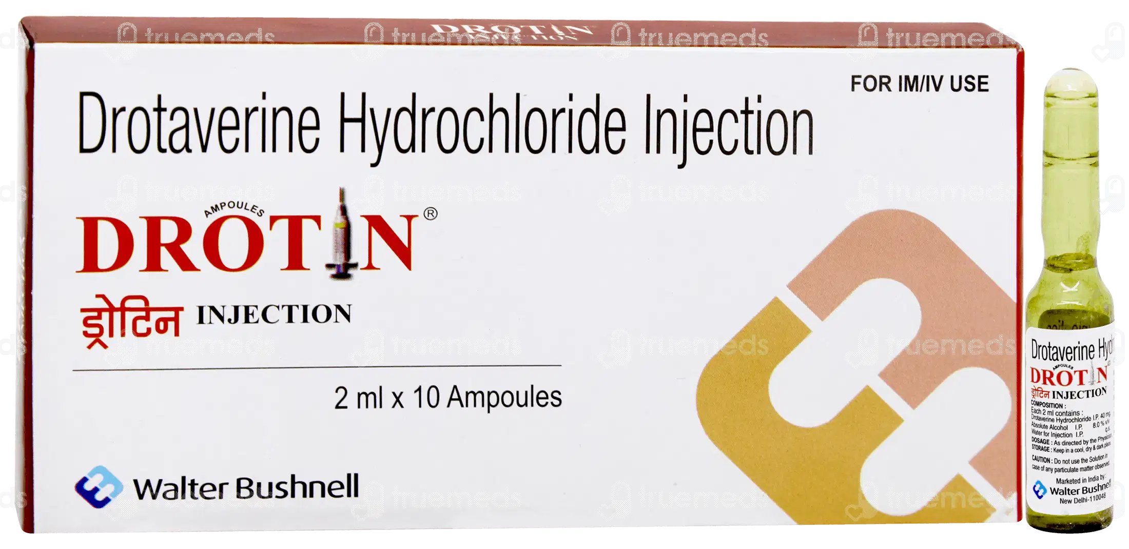 Drotin Injection (2 ml) is an antispasmodic medication containing 40mg of Drotaverine Hydrochloride (20 mg/ml) used to relieve smooth muscle spasms, including abdominal pain, menstrual cramps, renal colic, and biliary colic. It works by inhibiting the enzyme phosphodiesterase, relaxing muscles, and improving blood flow.